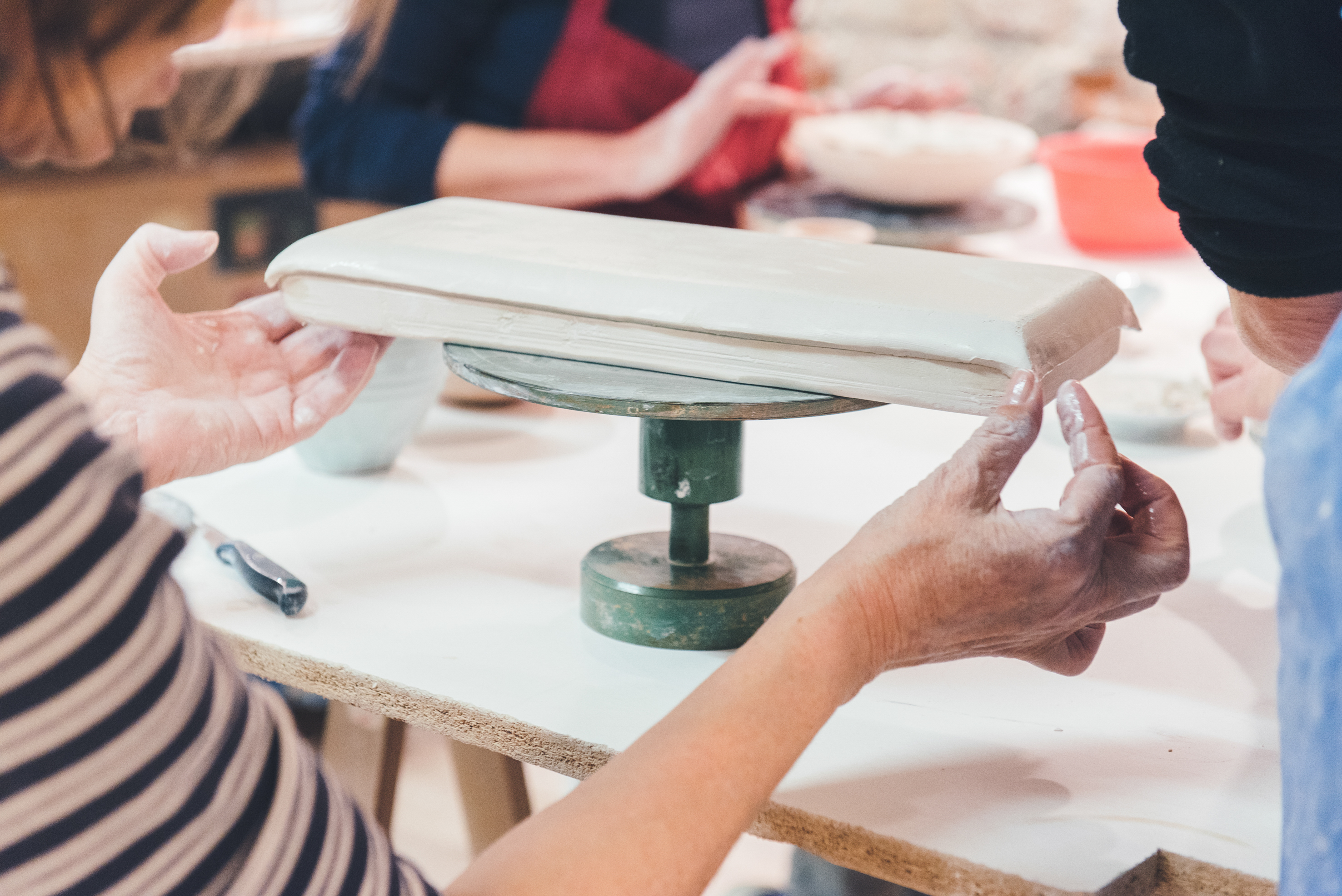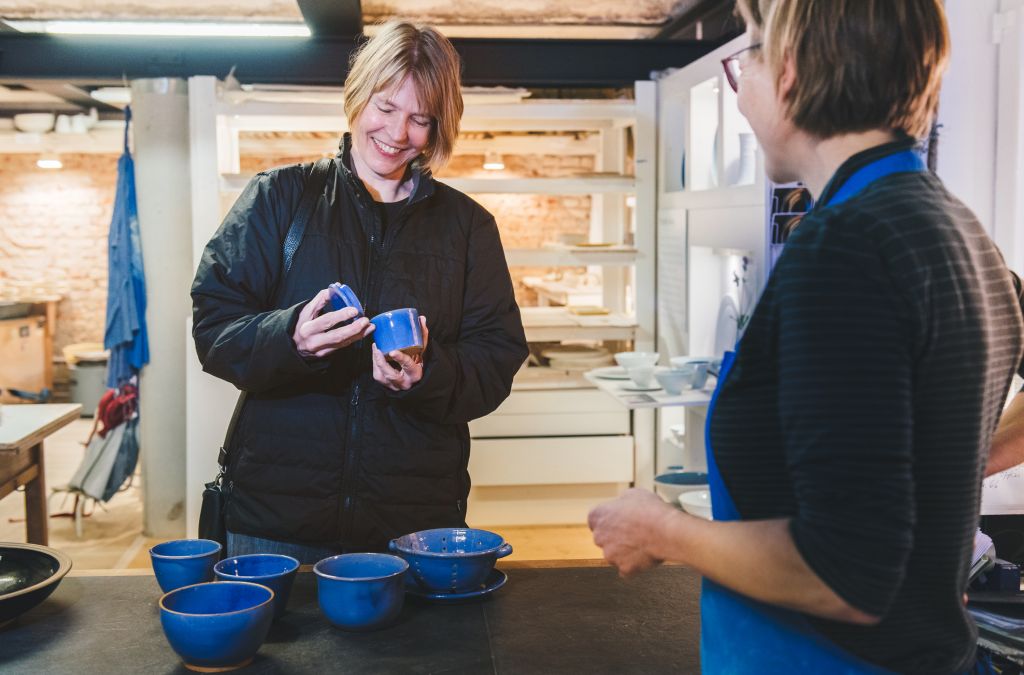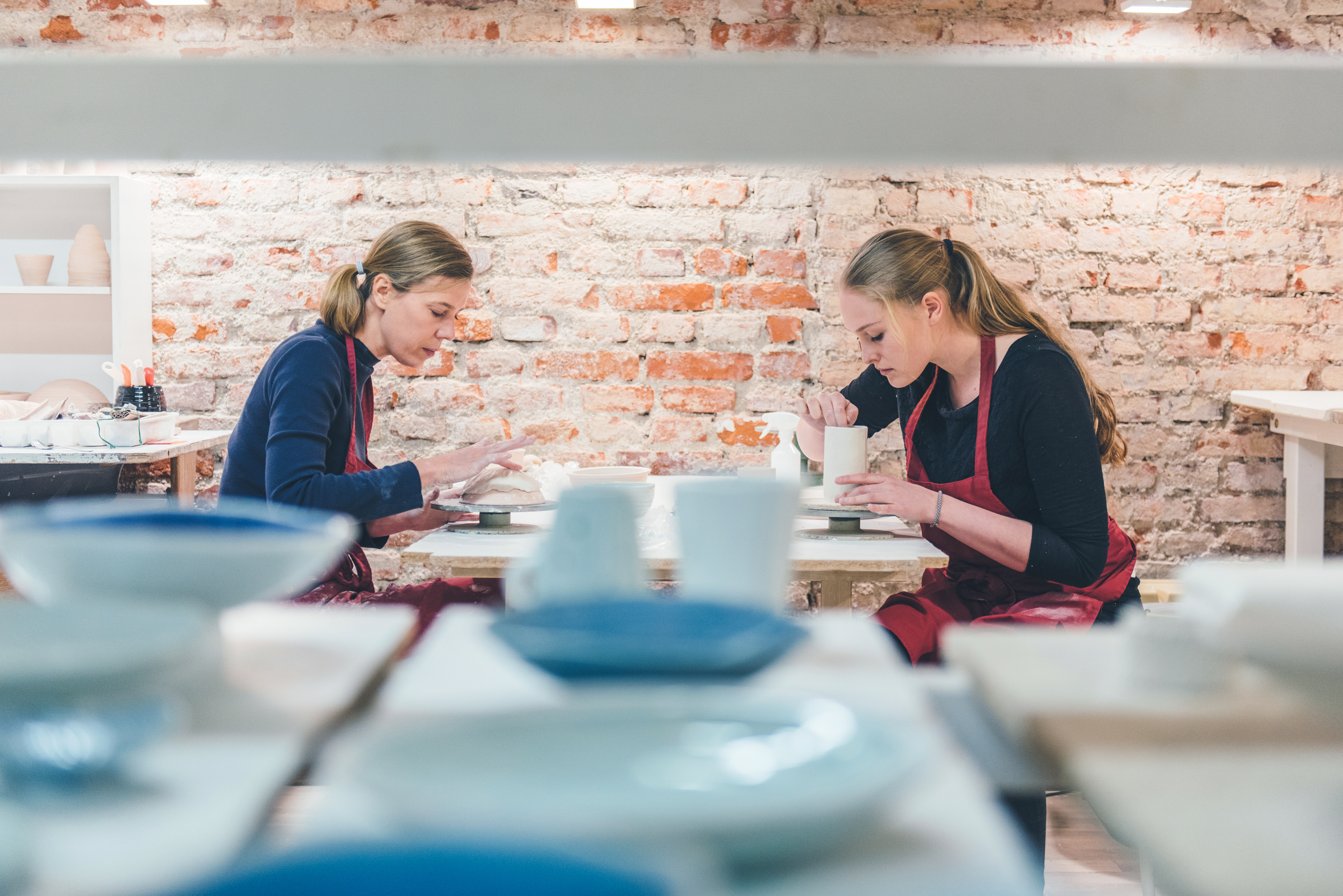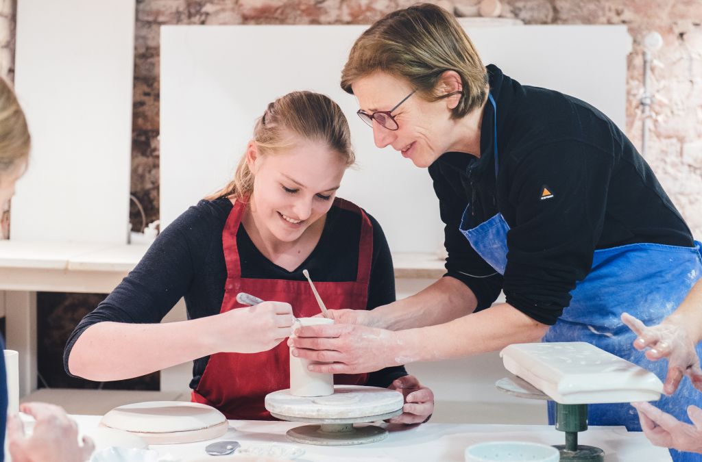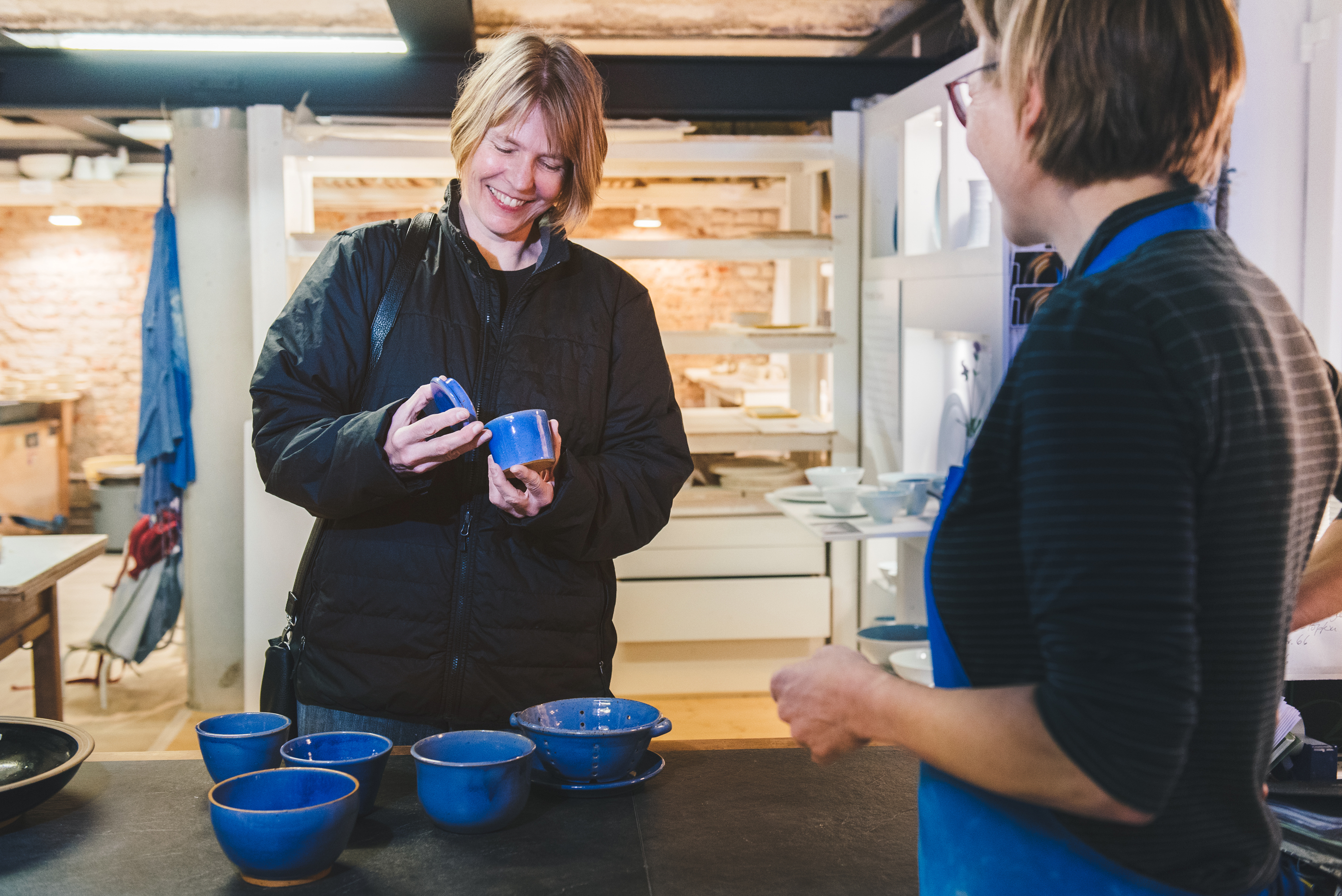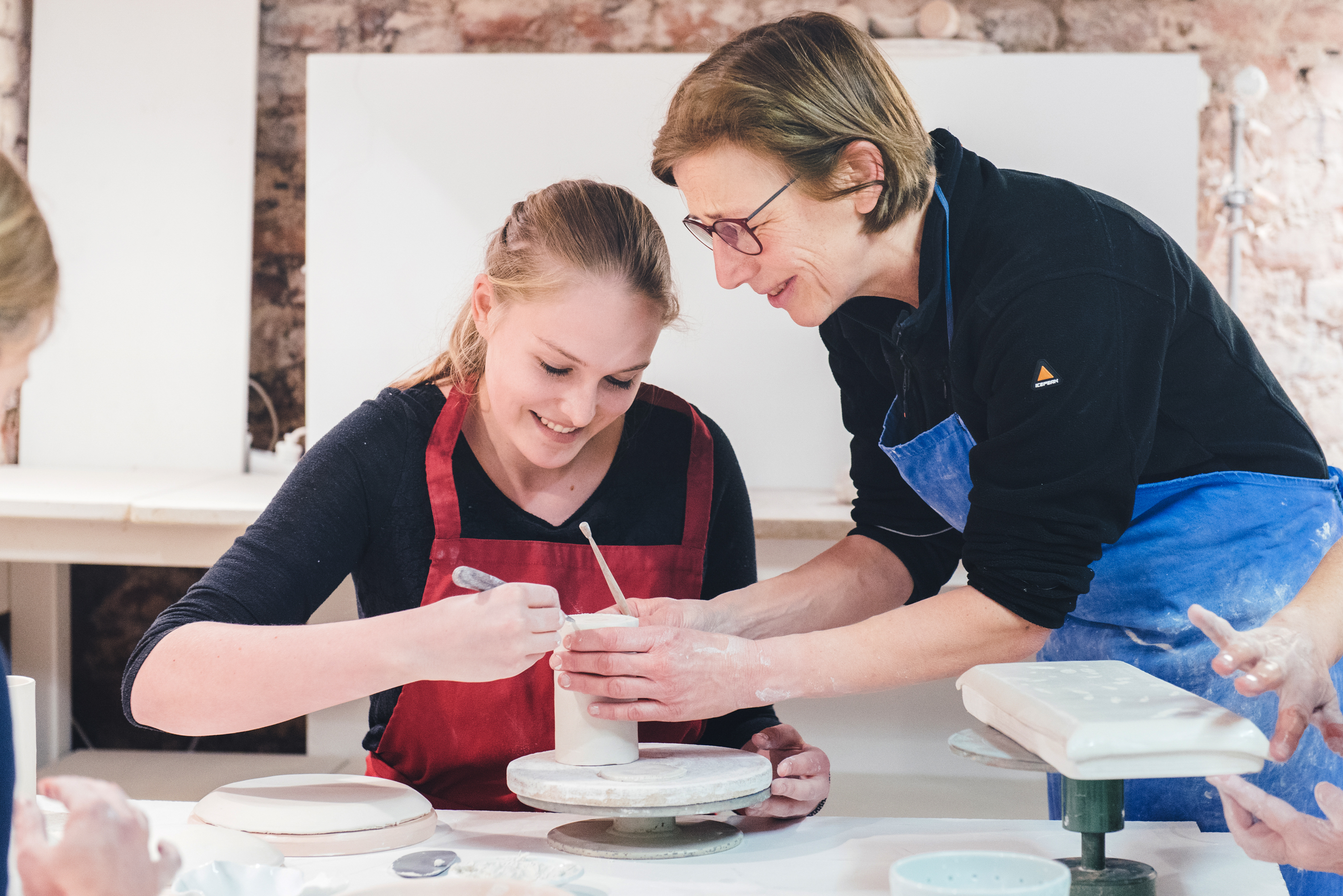 Manchmal verwandelt sich unsere Werkstatt in eine sympathische Lehranstalt mit einer entspannten aber konzentrierten Atmosphäre. In kleiner Gruppe und anregender Umgebung erklären wir den handwerklichen Umgang mit Ton und Porzellan. Dann hilft eine von uns jedem Teilnehmer mit Kniffs und Tricks weiter. Was fast einer Garantie dafür gleichkommt, dass nach dem späteren Brand ein wahrhaftes Lieblingsstück gelungen ist.