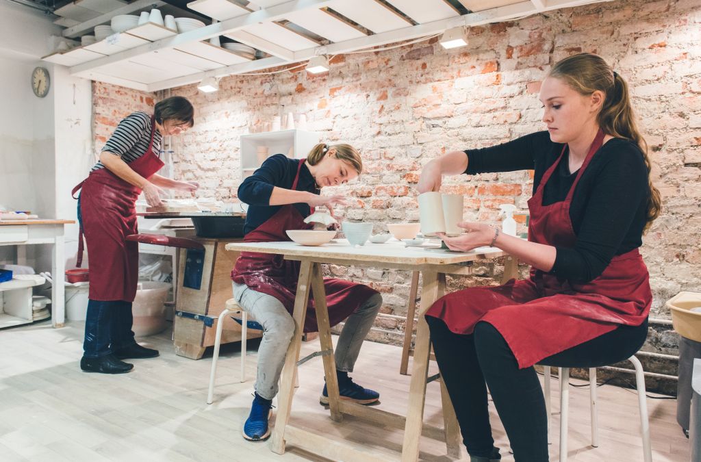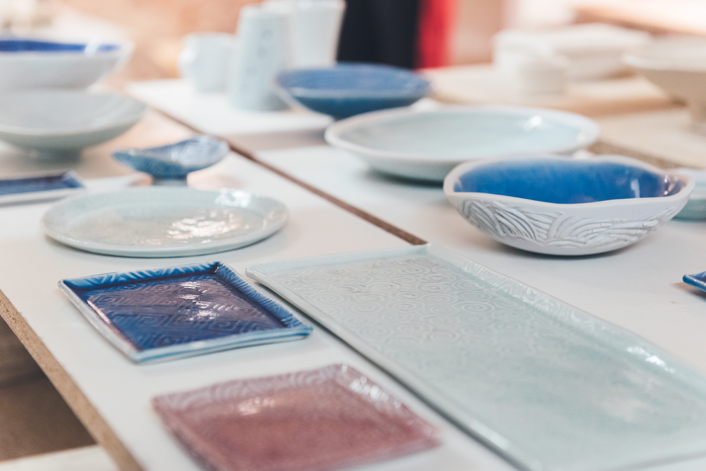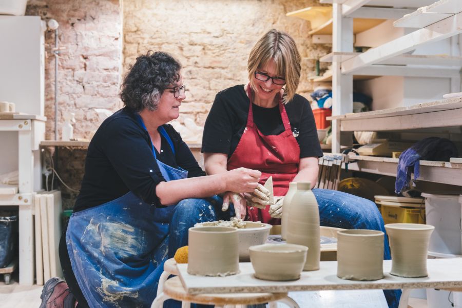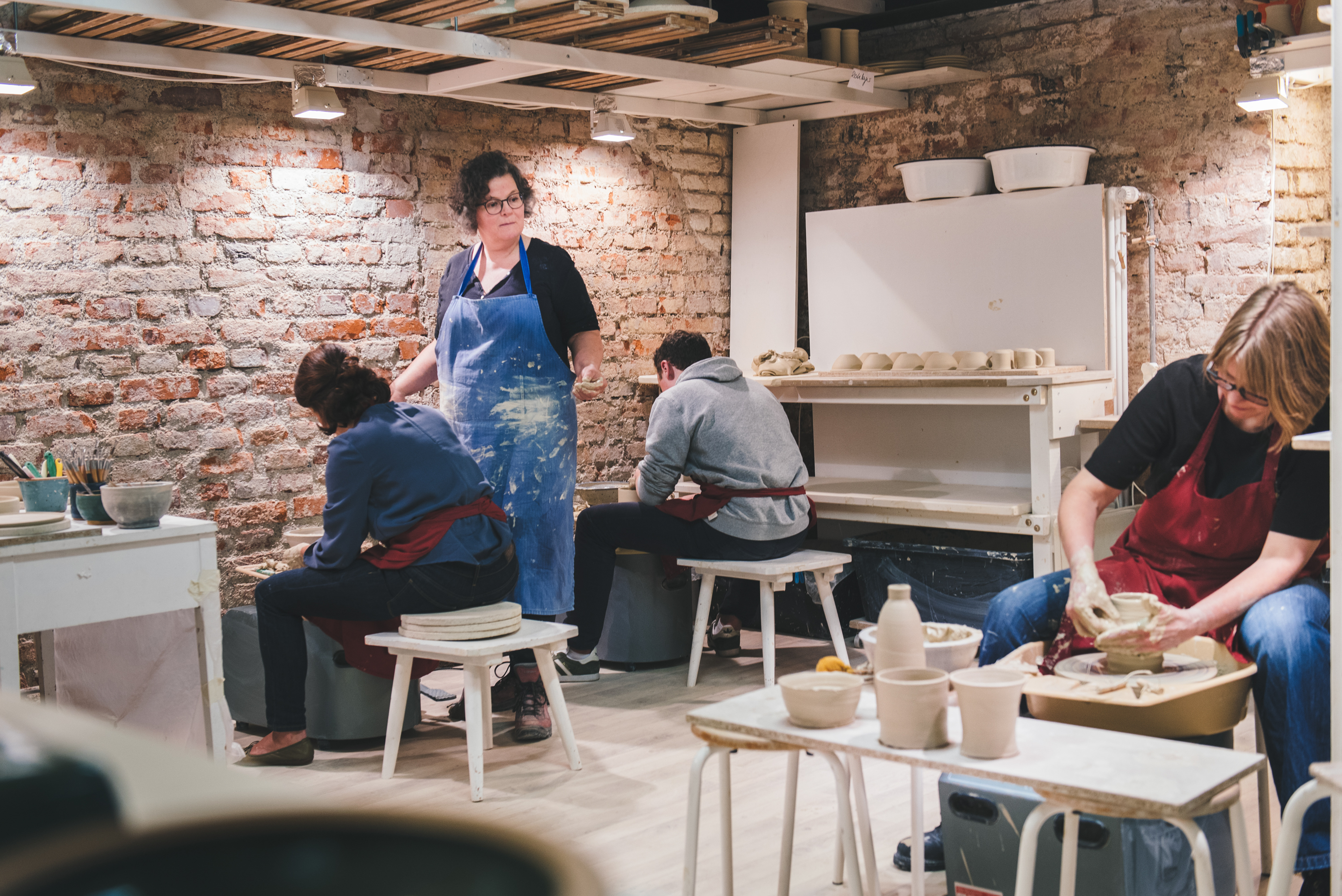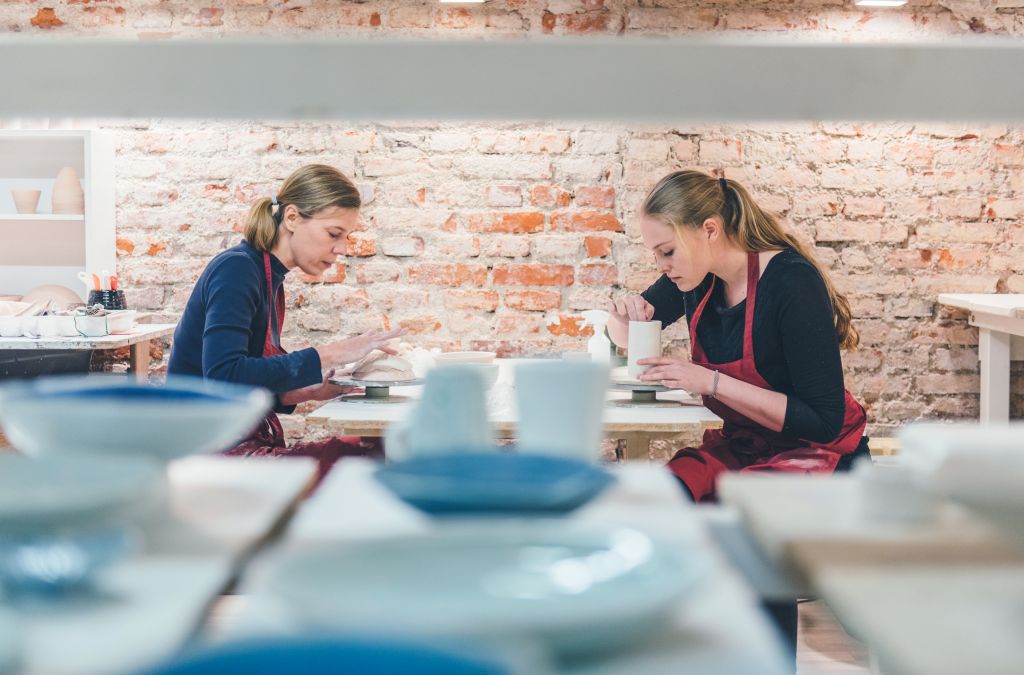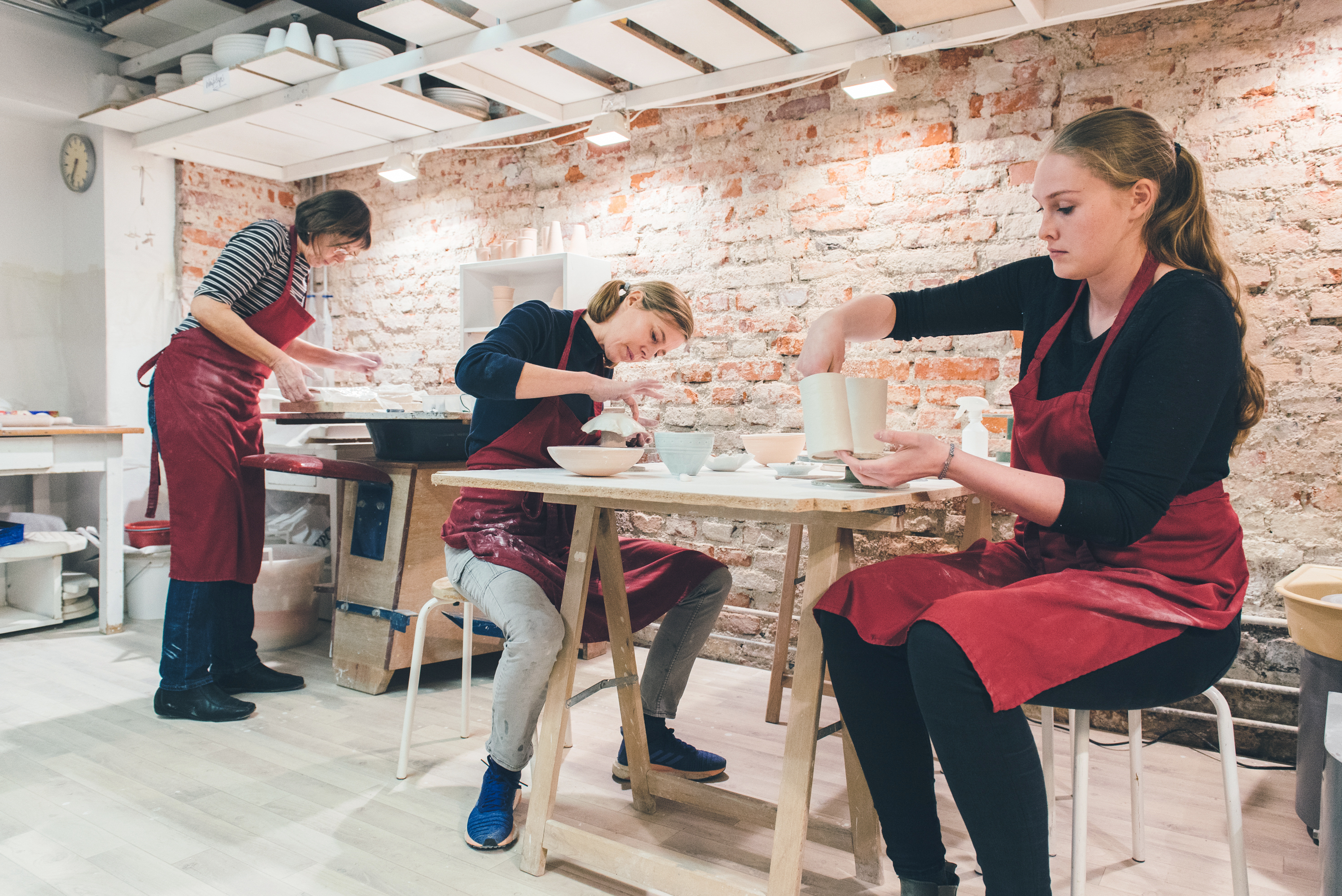 Manchmal verwandelt sich unsere Werkstatt in eine sympathische Lehranstalt mit einer entspannten aber konzentrierten Atmosphäre. In kleiner Gruppe und anregender Umgebung erklären wir den handwerklichen Umgang mit Ton und Porzellan. Dann hilft eine von uns jedem Teilnehmer mit Kniffs und Tricks weiter. Was fast einer Garantie dafür gleichkommt, dass nach dem späteren Brand ein wahrhaftes Lieblingsstück gelungen ist.