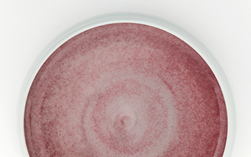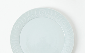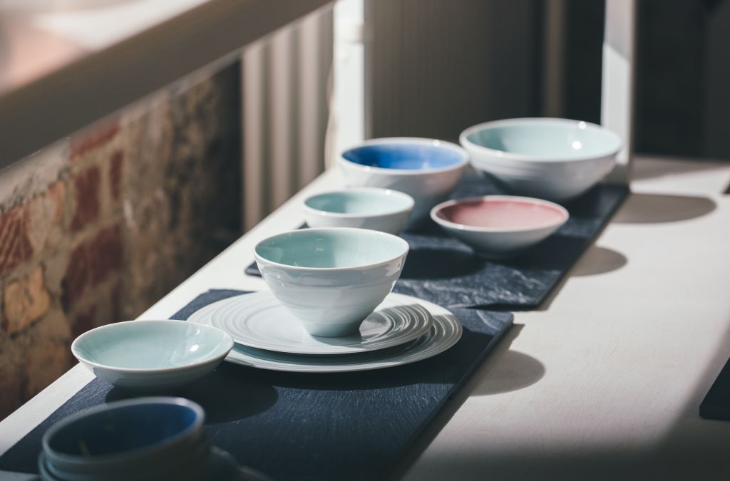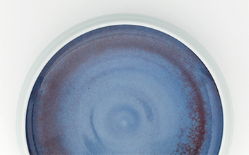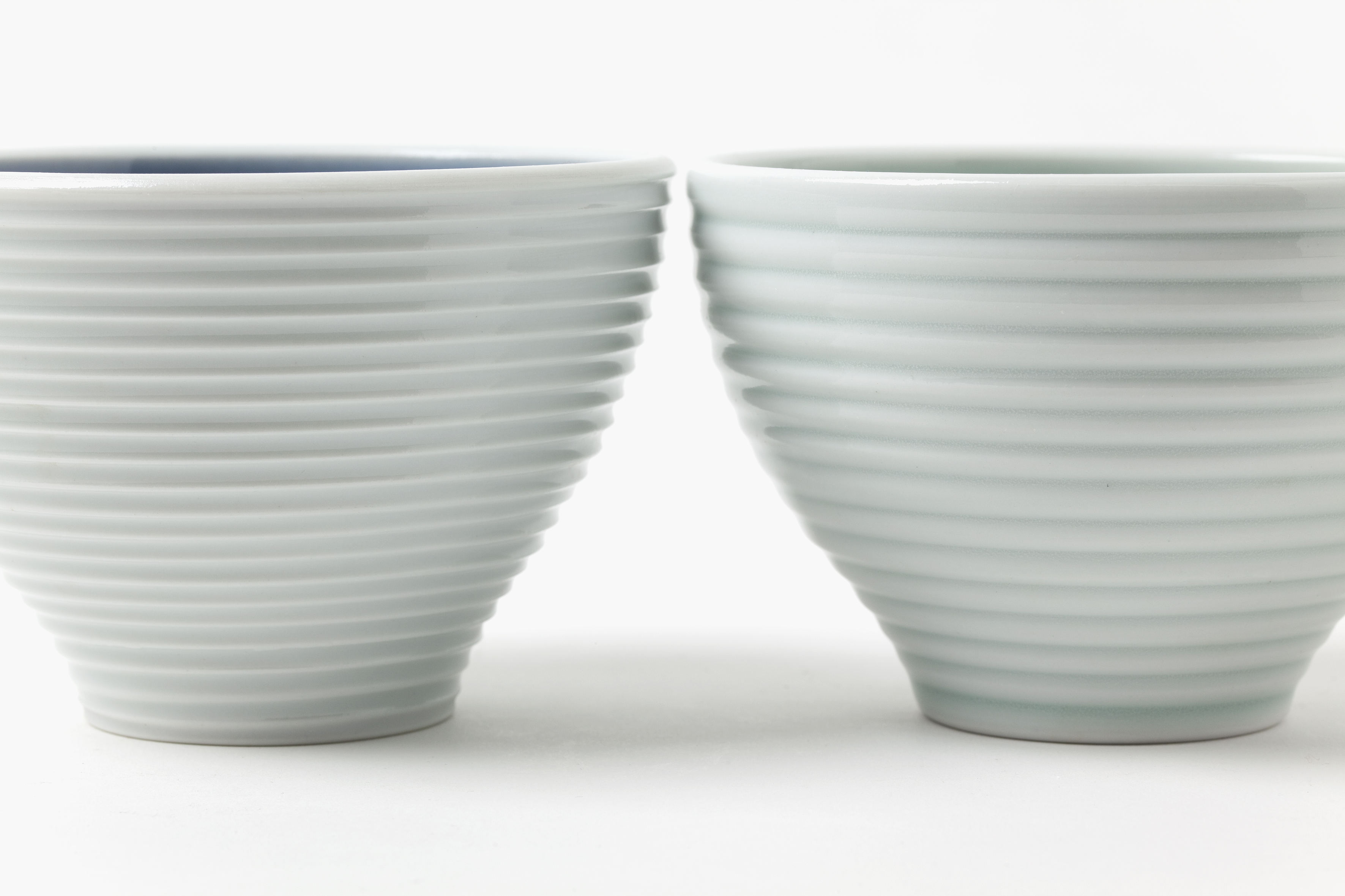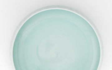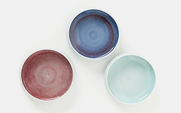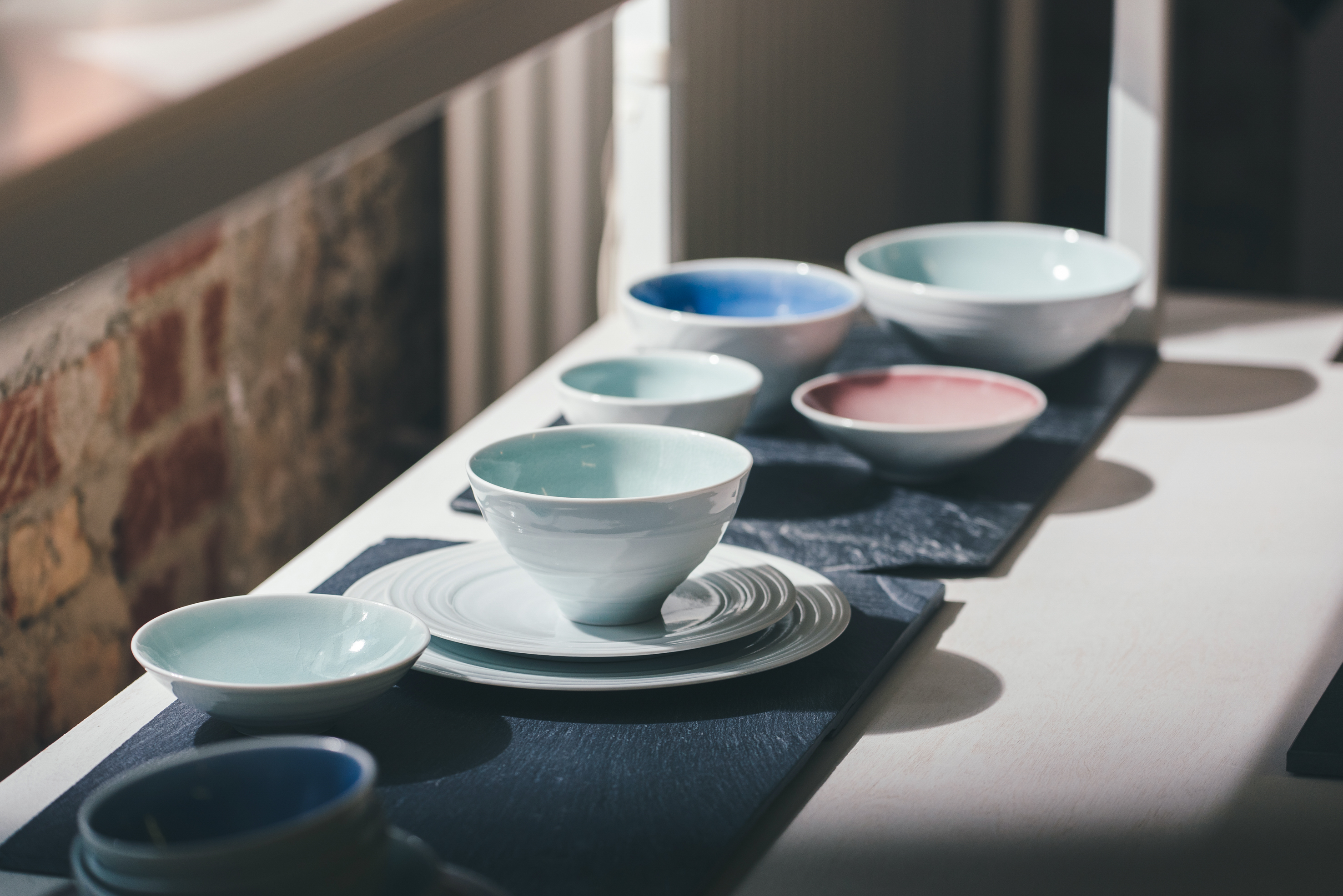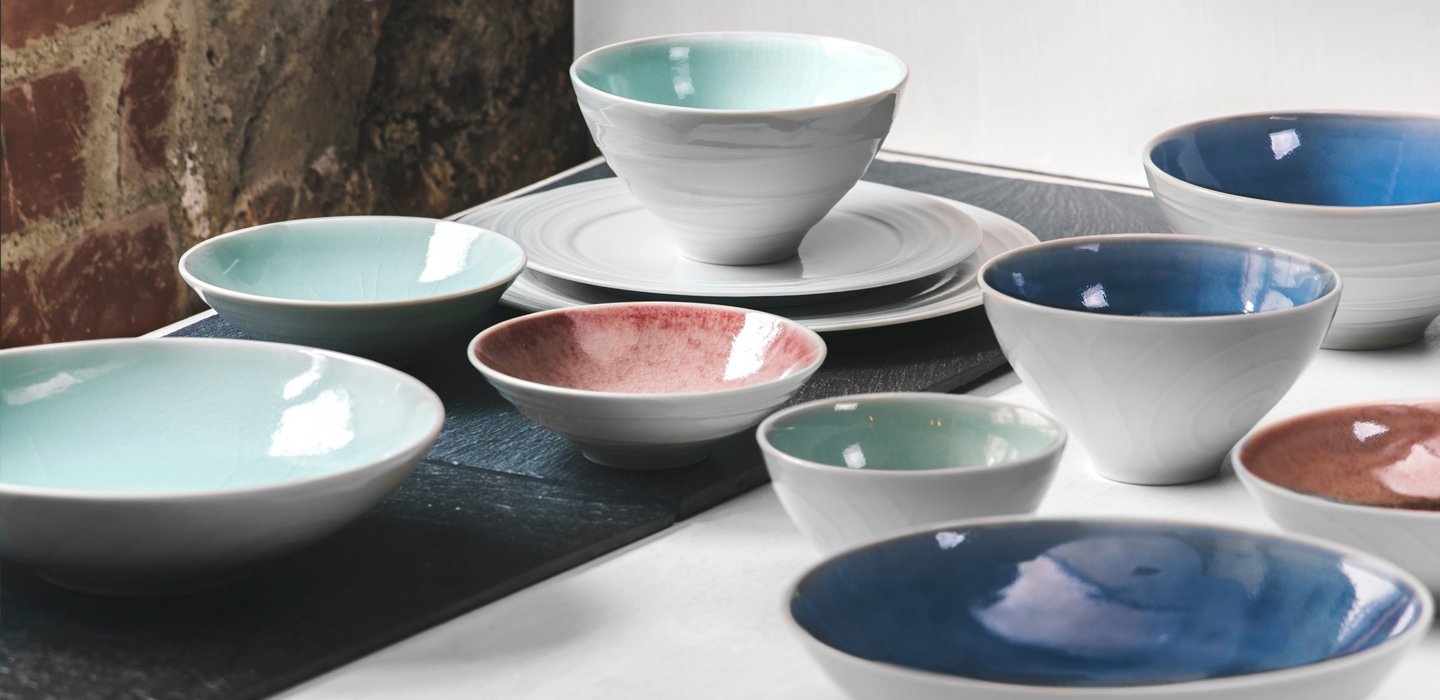 Keine Sorge. Drehen verfolgt uns noch nicht im Schlaf. Obwohl sogar unsere Dekore – kreisende Linie, Spirale und die bei eigenständigen Kleinserien zusätzlich verwendeten Rille und Michelin – zeichenhaft das handwerkliche Drehen aufgreifen. Dynamik passt eben zu unserem Geschäft. Und zu unserem Porzellan passen unsere nach eigenen Rezepten hergestellten Glasuren, die ihre changierende visuelle Faszination durch den Brand in reduzierender Atmosphäre bei offener Flamme entfalten. Alpinweiß glasieren wir normalerweise Teller und Außenseiten. Für die Innenglasur haben sie die Wahl zwischen Heiderot, Wolkenblau und Seladongrün.