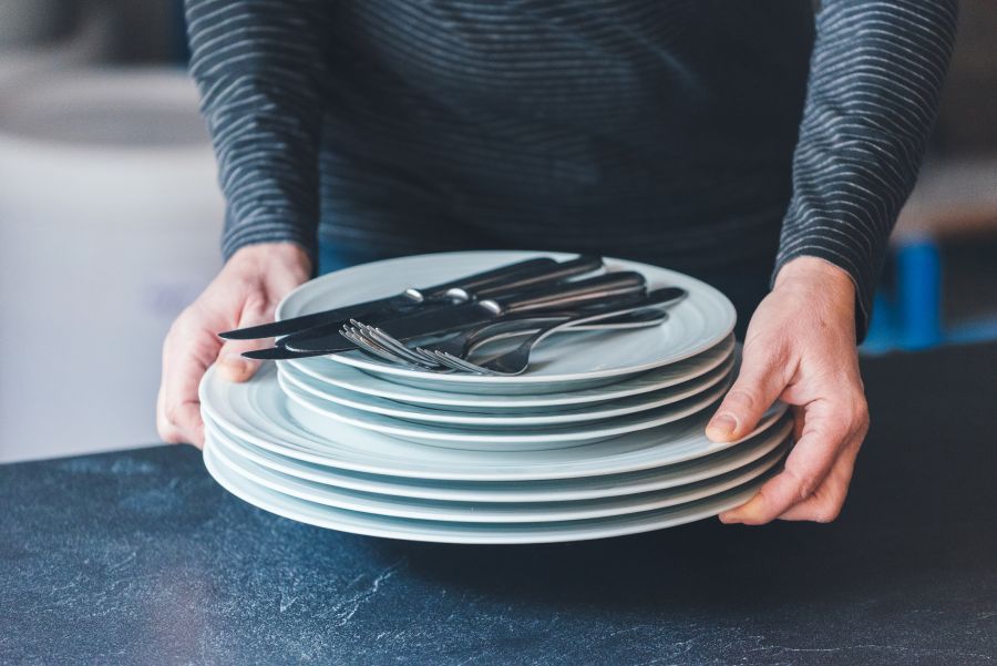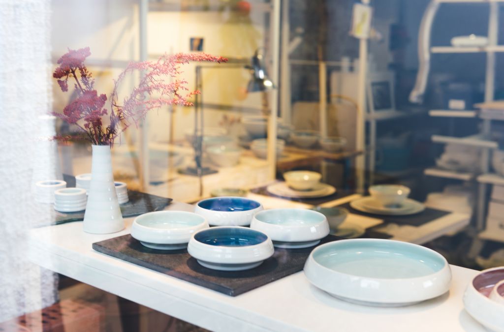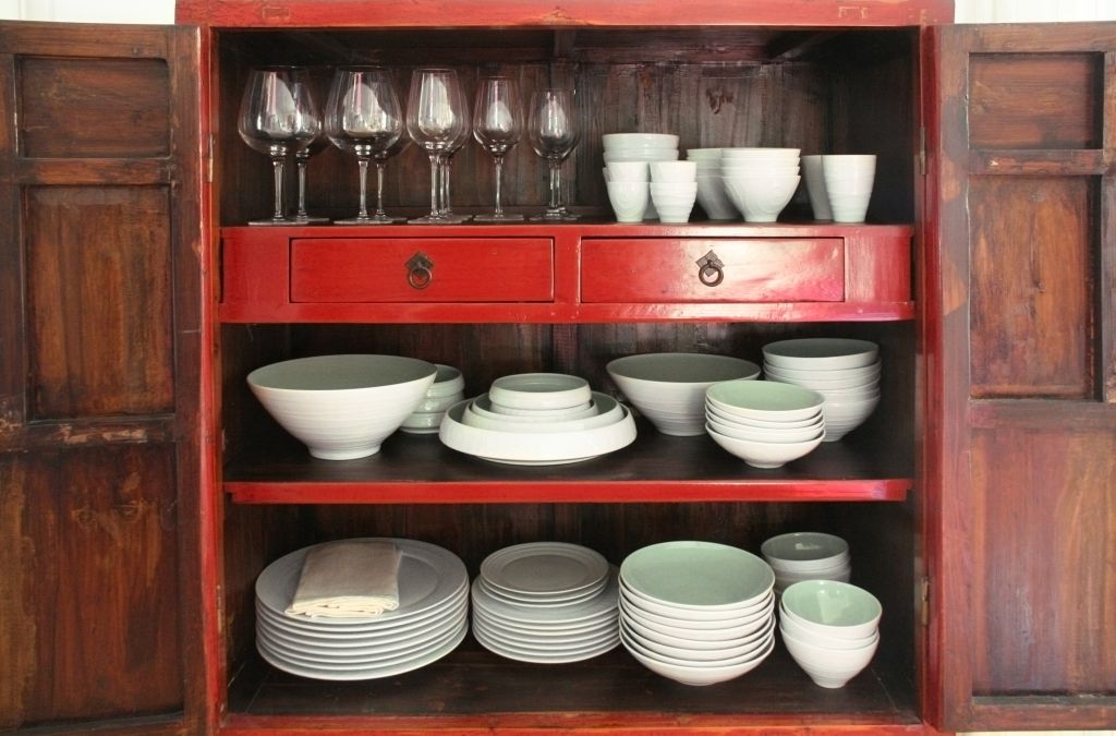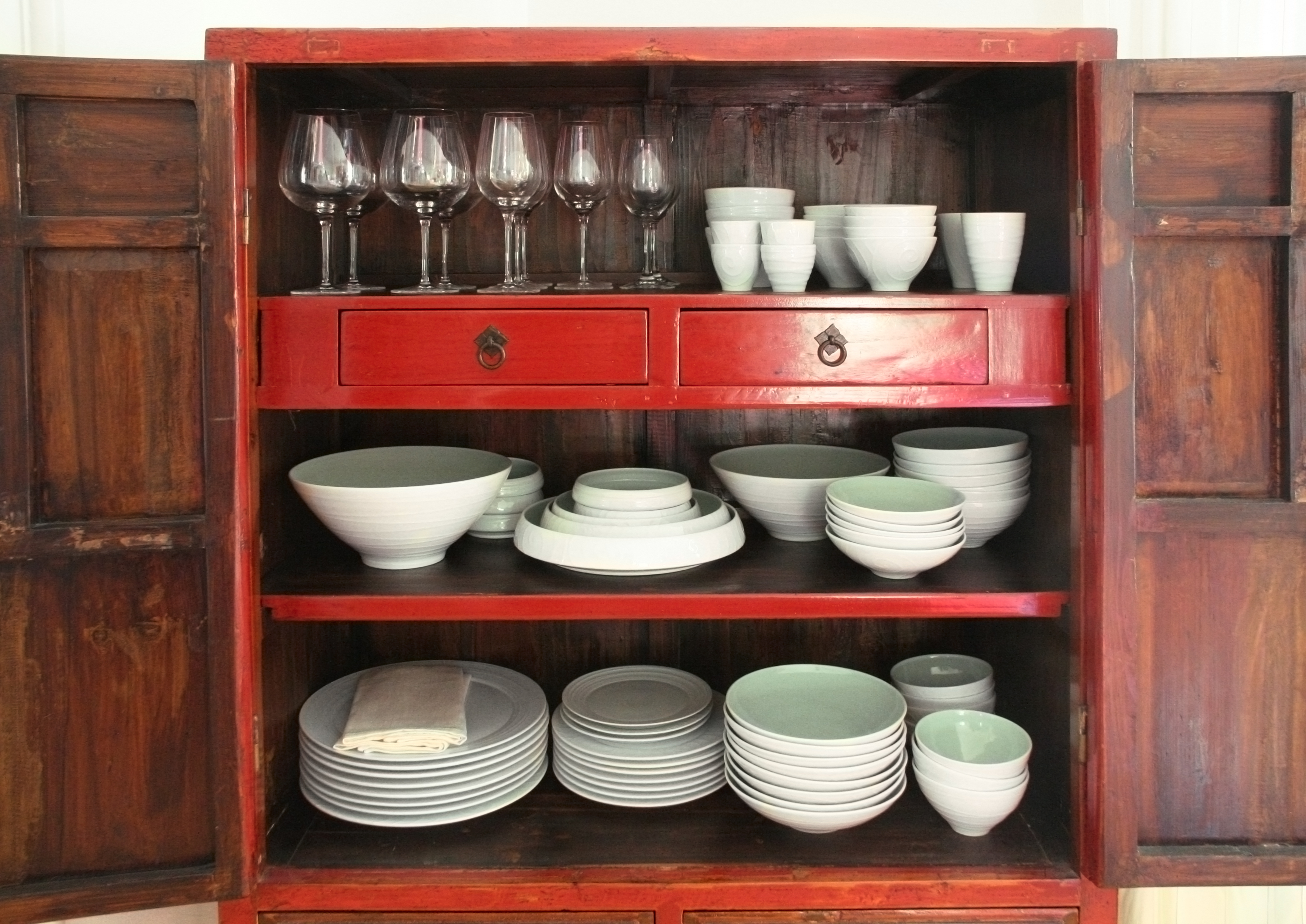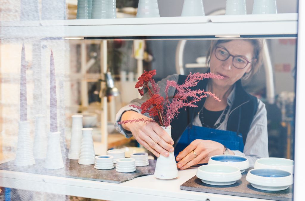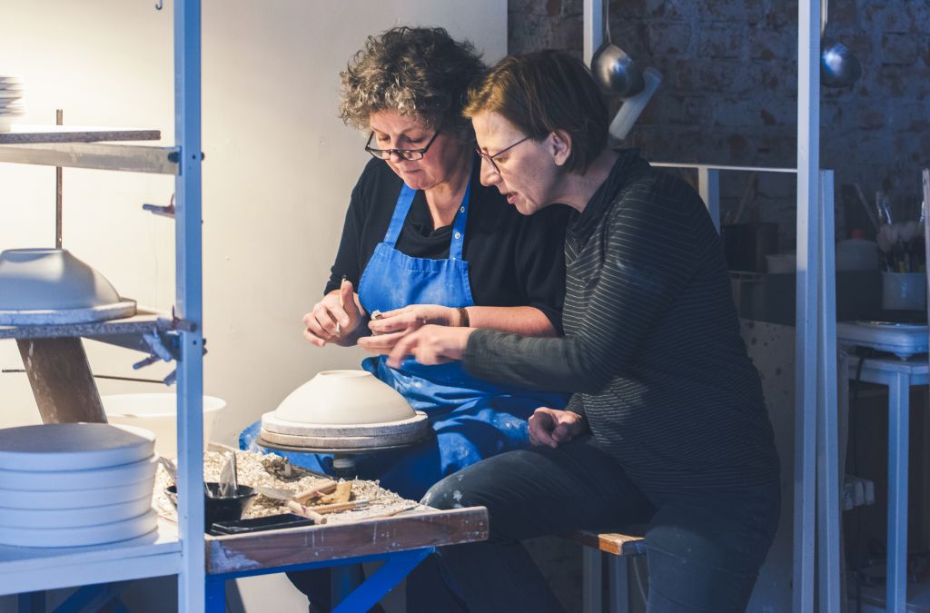 Keine Sorge. Drehen verfolgt uns noch nicht im Schlaf. Obwohl sogar unsere Dekore – kreisende Linie, Spirale und die bei eigenständigen Kleinserien zusätzlich verwendeten Rille und Michelin – zeichenhaft das handwerkliche Drehen aufgreifen. Dynamik passt eben zu unserem Geschäft. Und zu unserem Porzellan passen unsere nach eigenen Rezepten hergestellten Glasuren, die ihre changierende visuelle Faszination durch den Brand in reduzierender Atmosphäre bei offener Flamme entfalten. Alpinweiß glasieren wir normalerweise Teller und Außenseiten. Für die Innenglasur haben sie die Wahl zwischen Heiderot, Wolkenblau und Seladongrün.